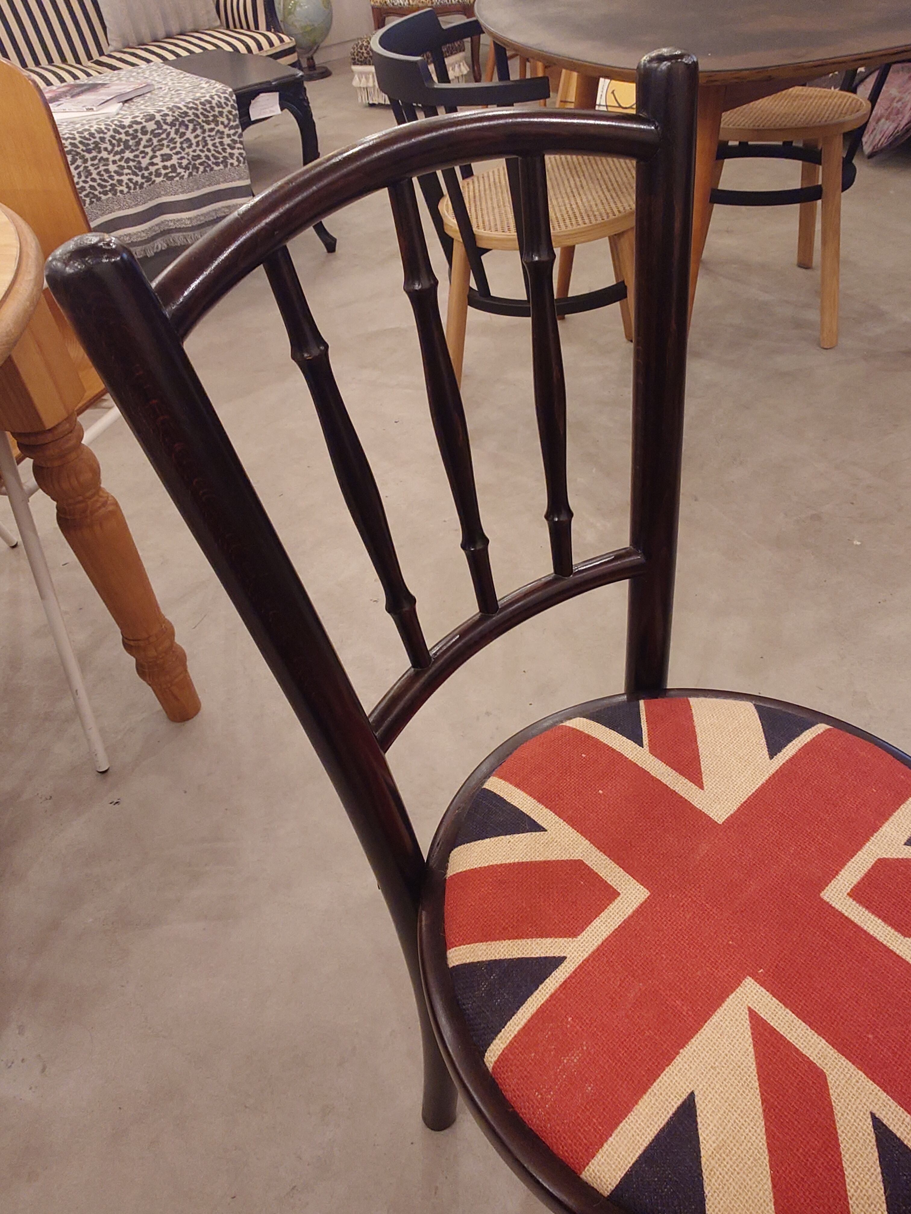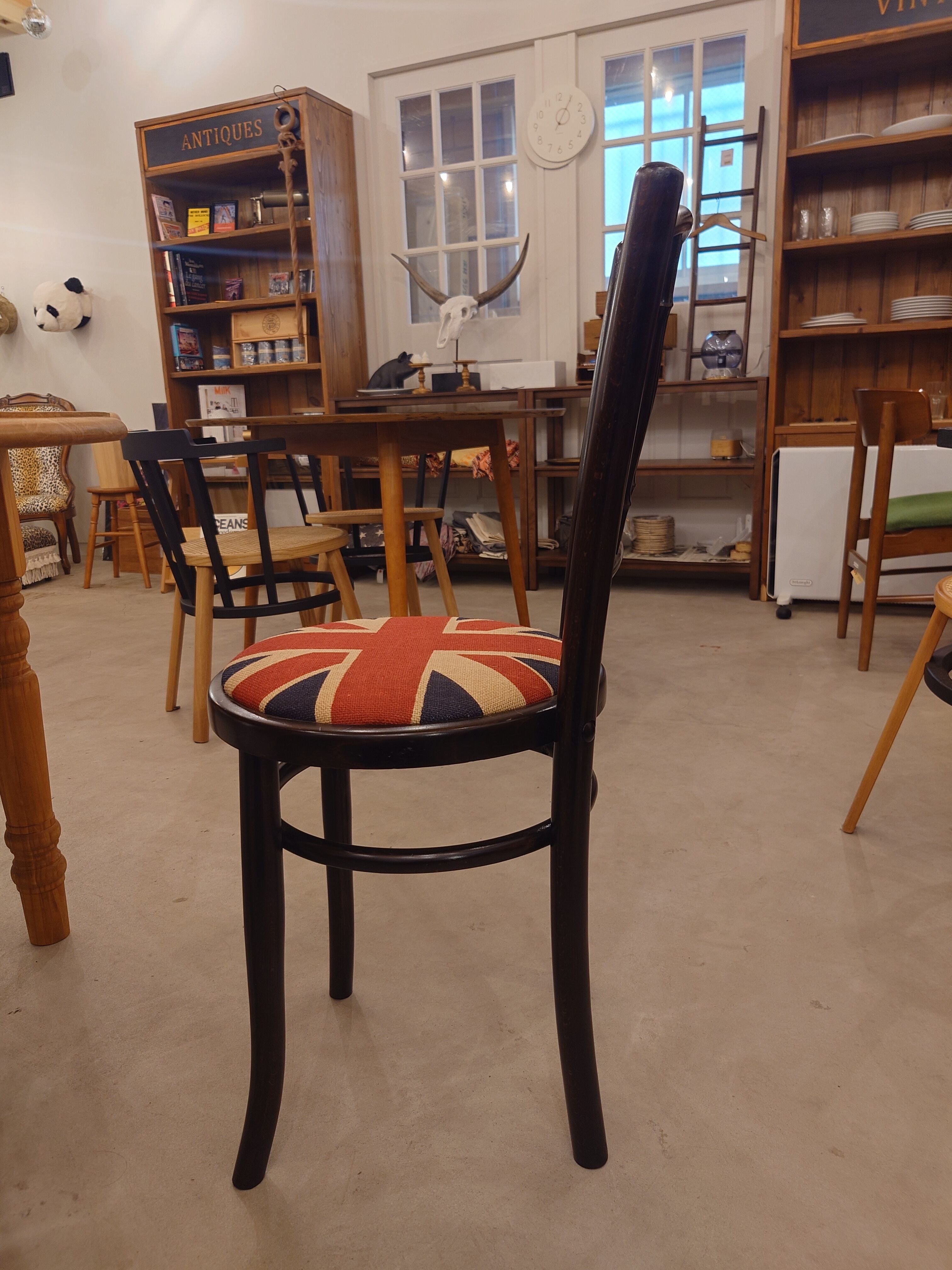 座面を店長大好物のユニオンジャック柄に張り替えたデザインのベントウッドチェアです。
