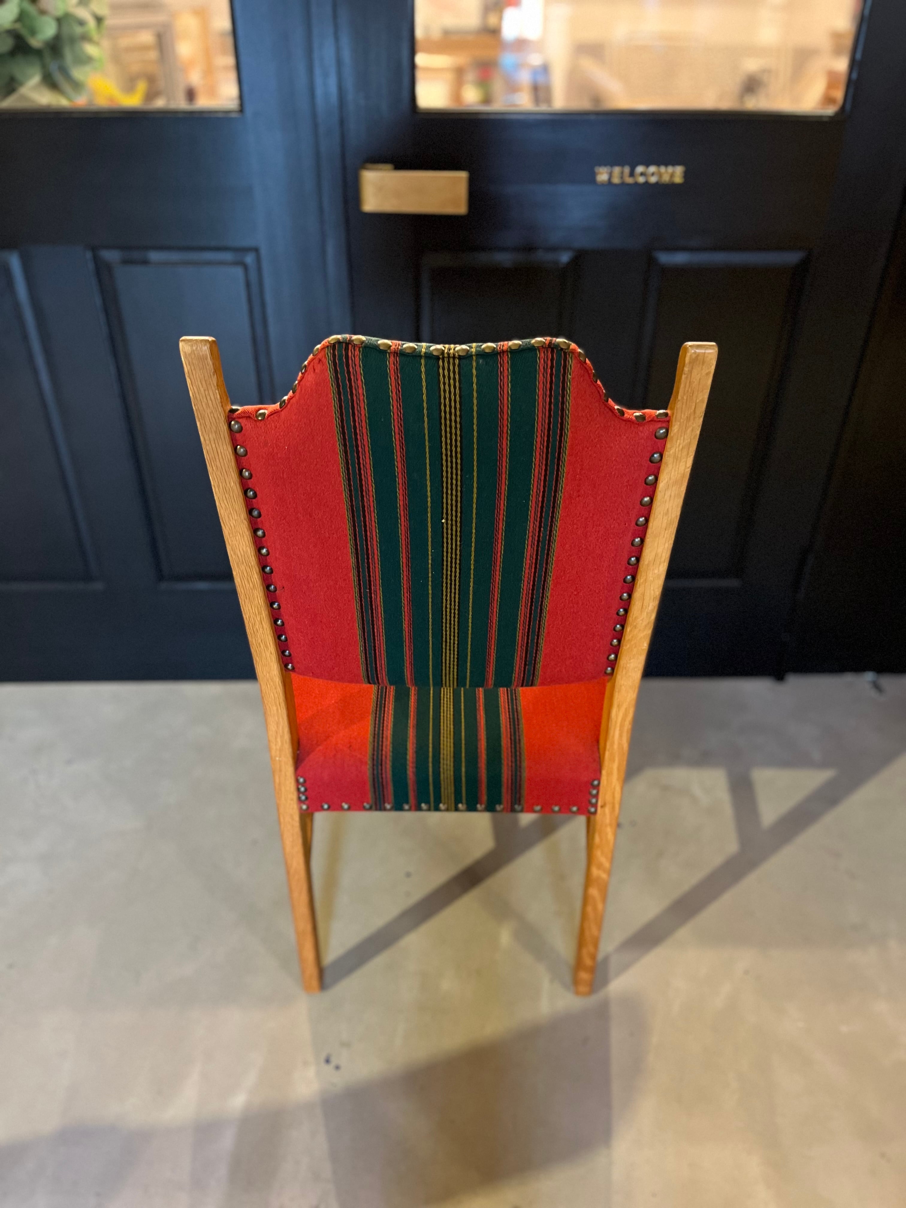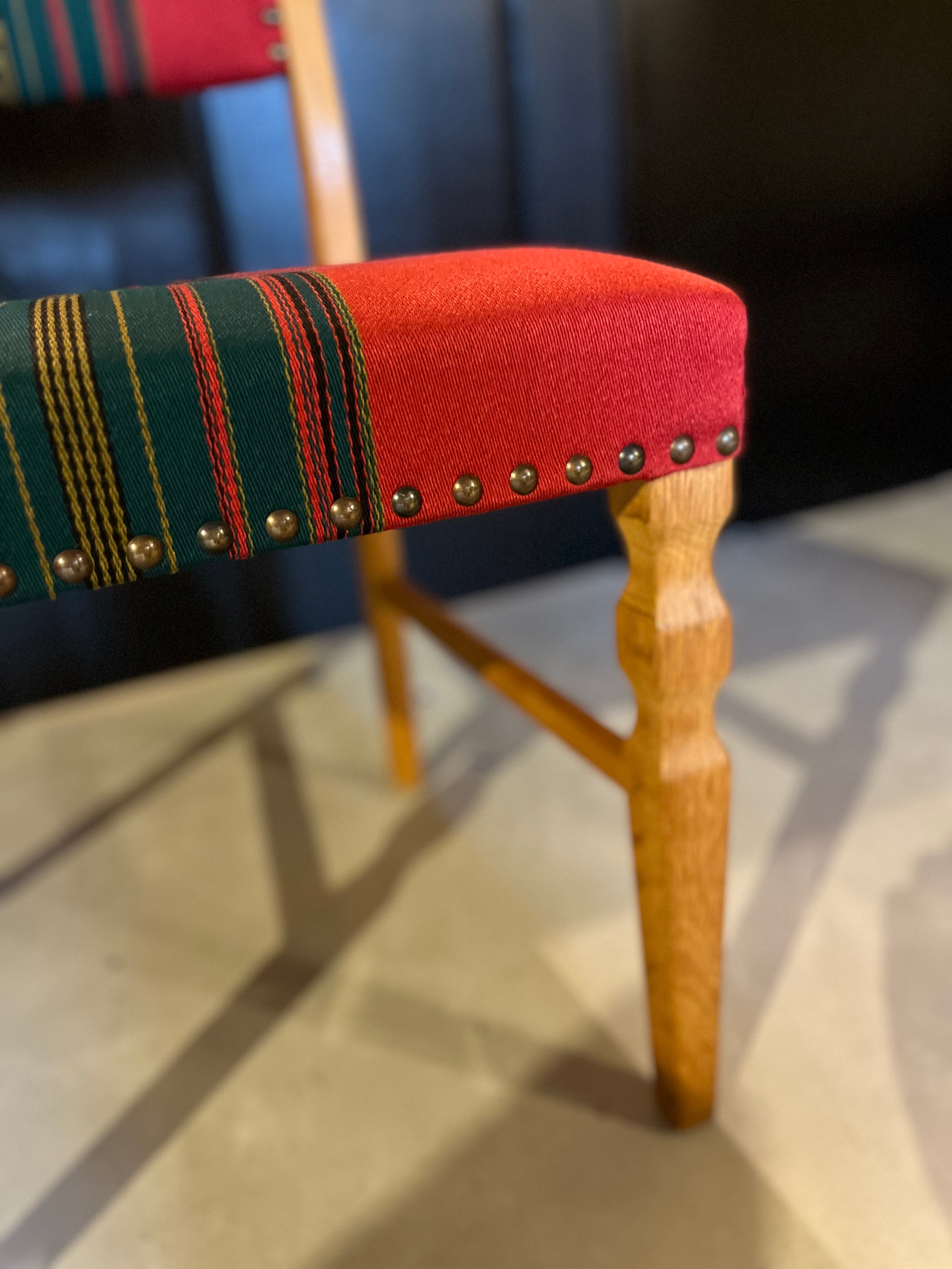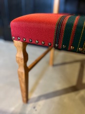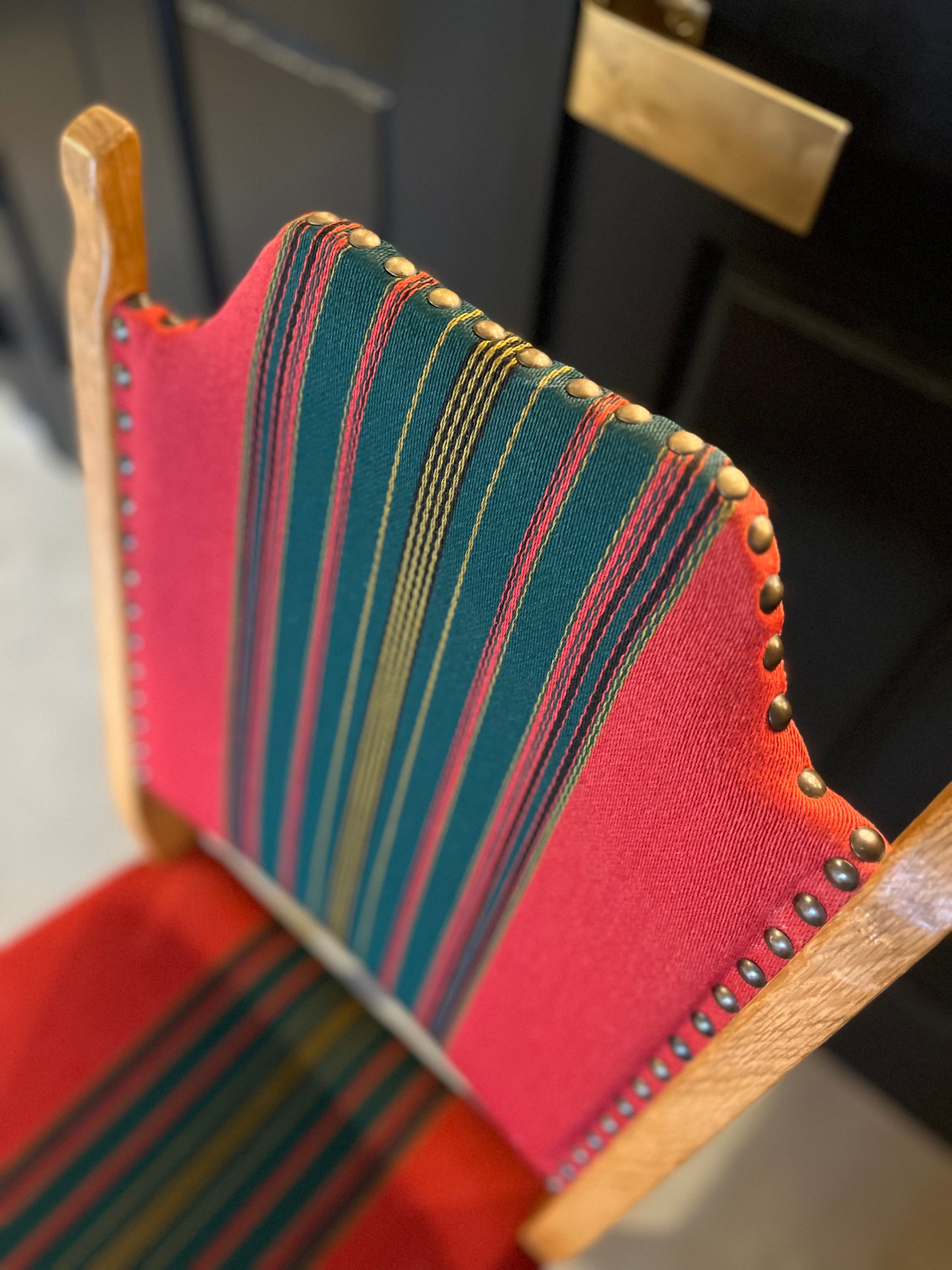張地は深みのある赤と緑のストライプ柄で、鋲でおさえてあるのがアクセントで高級感も醸し出しています。