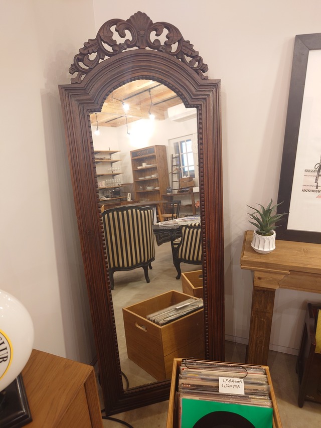 豪華な彫刻に深みのある木材の色がよりヴィンテージ感を醸し出しています。 自立タイプなので、どこにでも置くことができます。 玄関や寝室の姿見としていかがでしょうか。 【サイズ】 W59cm×H161cm ・現地受け取り専用商品です。 ・商品写真は実物の色に近づけるよう努めておりますが、モニターやブラウザの環境により色の見え方が異なる場合がございます。予めご了承ください。