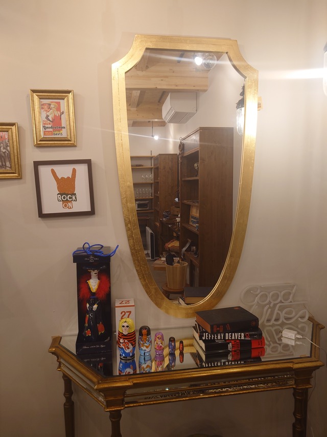 ゴールドメッキのような味わいのある塗装で仕上げてあります。 玄関先にもドレッサーミラーとしてもいずれも設置高さによって丁度よい大きさになります。 【サイズ】 W61cm×H117cm ・現地受け取り専用商品です。 ・商品写真は実物の色に近づけるよう努めておりますが、モニターやブラウザの環境により色の見え方が異なる場合がございます。予めご了承ください。